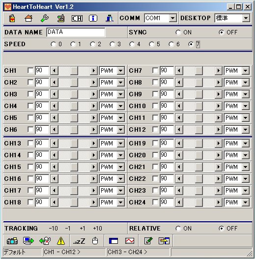 各サーボが、CH1〜24(まなぶ君は17個のサーボ)へ割り当てられていて、中立(90度)から