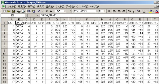 サンプルファイルがあるので、それを参考に、数値を書き込みますが、このデータは、エクセルの CSV関数として記述されていて、ロボットのホームポジション(立っている状態)に対する相対数値として、記述されています。