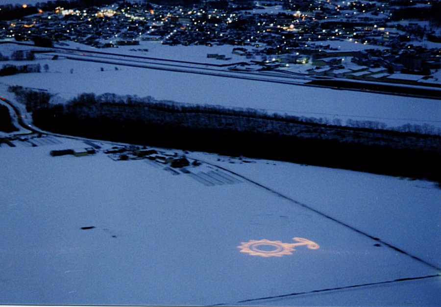 女満別町は、ひまわりの花畑の風景も有名です。 2月10日(土)、除雪機で雪を彫って作った隣に、電飾を使ってひまわりを画きました。 これで、夕方、暗くなってからの着陸でも大丈夫。 雪が降っても消えません。