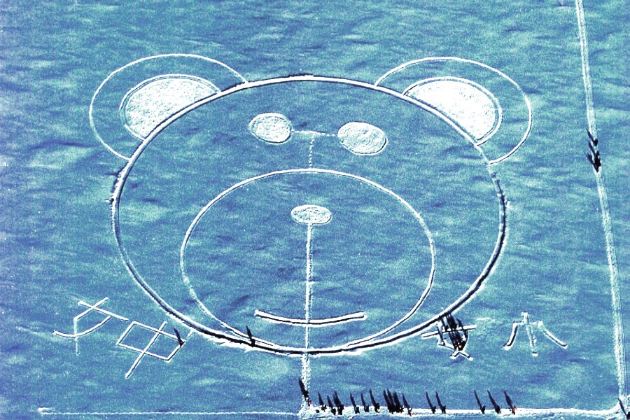 2月17日(土)、やっと、少し積雪があり、湖が使えるようになりました。 女満別小学校 & 女満別中学校の児童と先生30人ほどで、“くまさん”を画きました。 今日もまずまずの天気です。