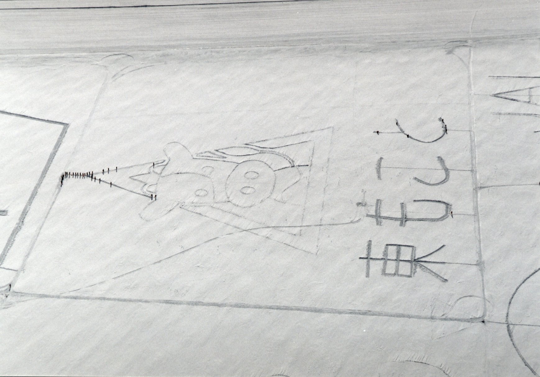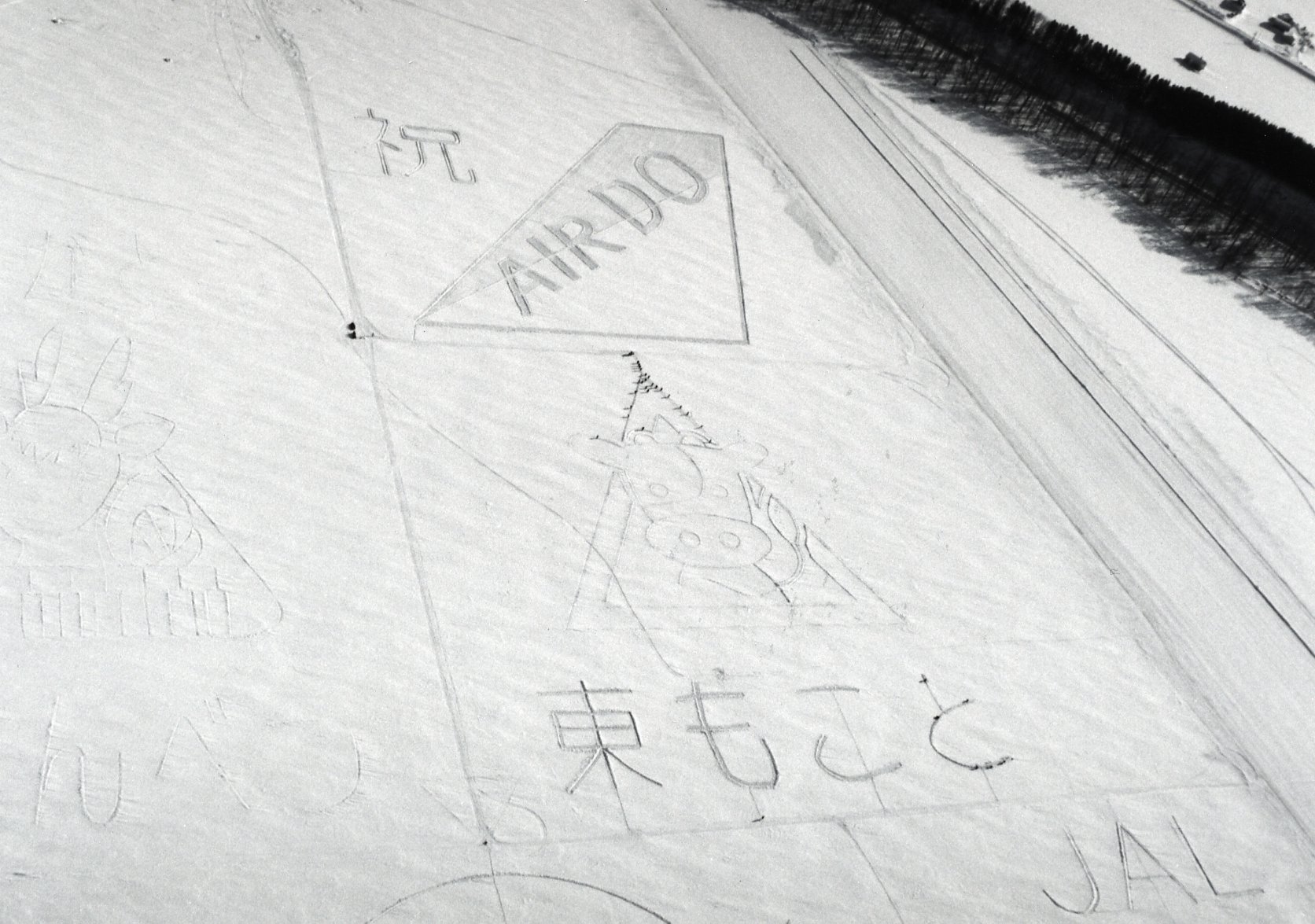 完成した翌日に、撮影した画像です。細かく踏んだ所が「黒く」成っていますが 昨夜の「風と雪」の為に、一部不鮮明になってきています。(残念!!) 今回の『絵・文字』へ これまでの『絵・文字』へ ホームへ